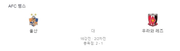 지난 19일 우라와 원정에서의 경기에서 울산현대의 주민규와 황일수의 골로 역전승을 거둔 성적을 거둔바 있어서 홈에서 열리는 2차전이 다소 유리한 상황이라고 보여지고 있습니다.
